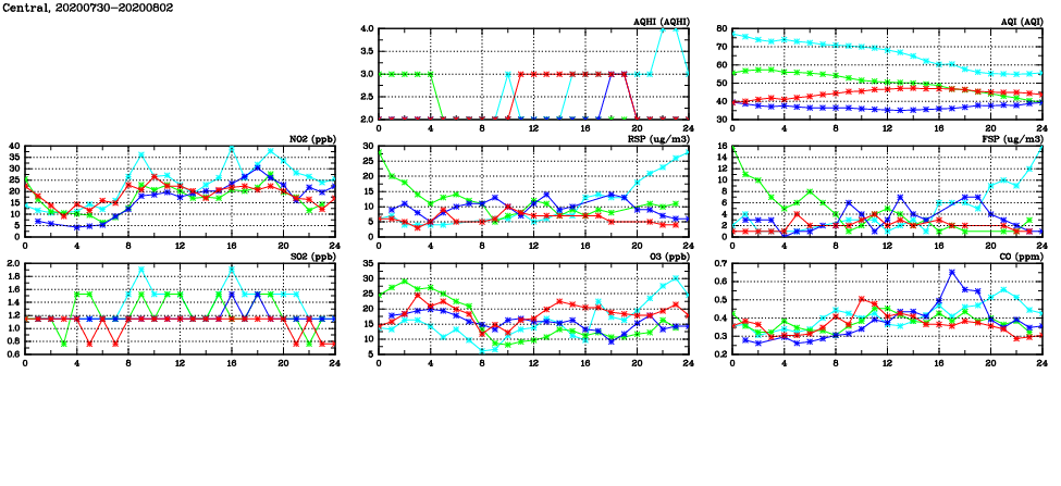 | Air Quality Data Time Series in Central (2020/08/02) | ( Line colors: Day -3 Day -2 Day -1 Current day ) | 2D Map Current AQHI |