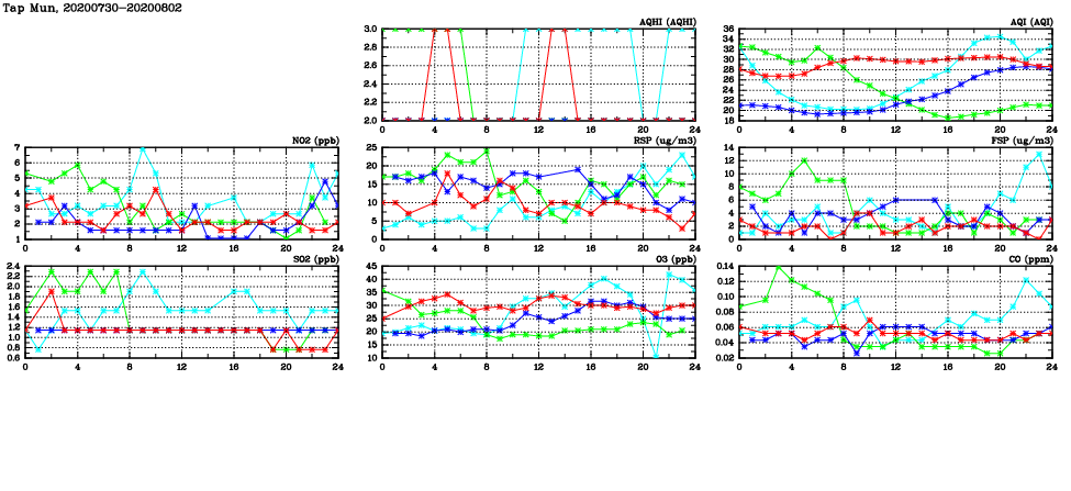 | Air Quality Data Time Series in Tap Mun (2020/08/02) | ( Line colors: Day -3 Day -2 Day -1 Current day ) | 2D Map Current AQHI |