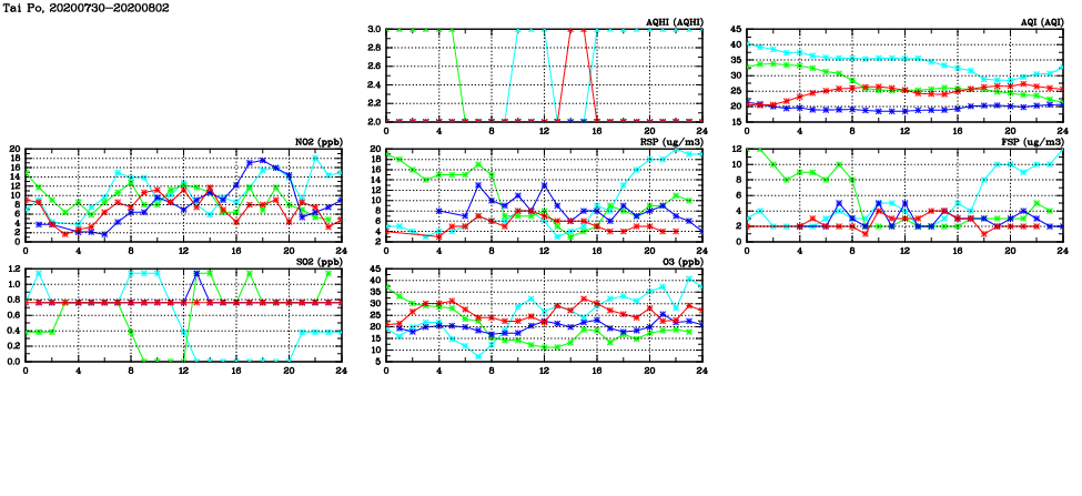 | Air Quality Data Time Series in Tai Po (2020/08/02) | ( Line colors: Day -3 Day -2 Day -1 Current day ) | 2D Map Current AQHI |