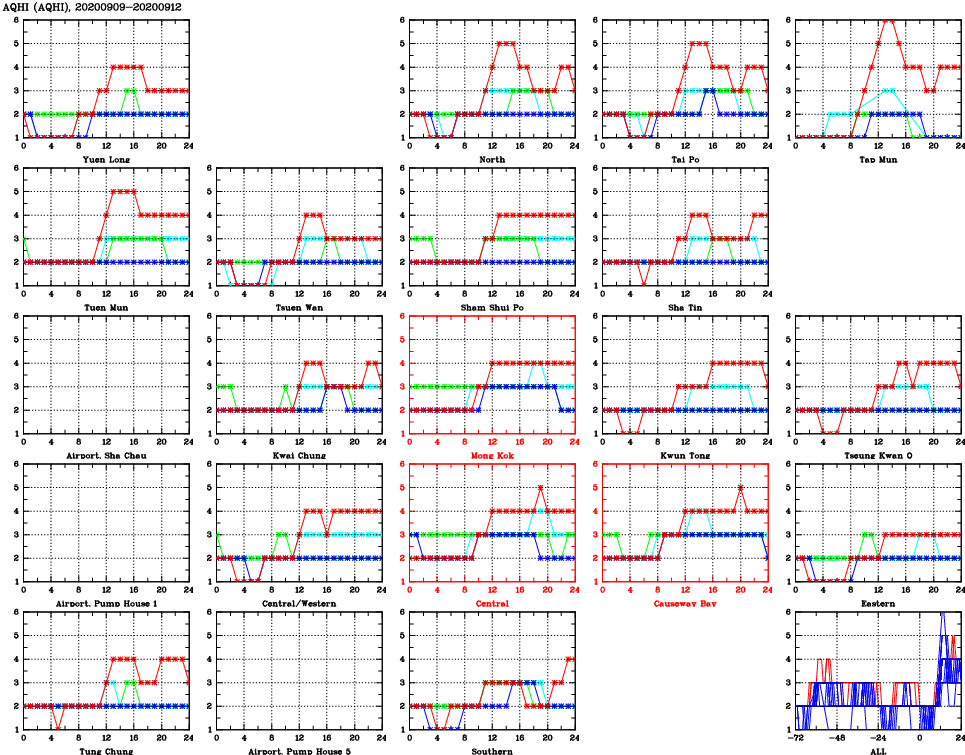 | Air Quality Data Time Series for AQHI (2020/09/12) | ( Line colors: Day -3 Day -2 Day -1 Current day ) | 2D Map Current AQHI |