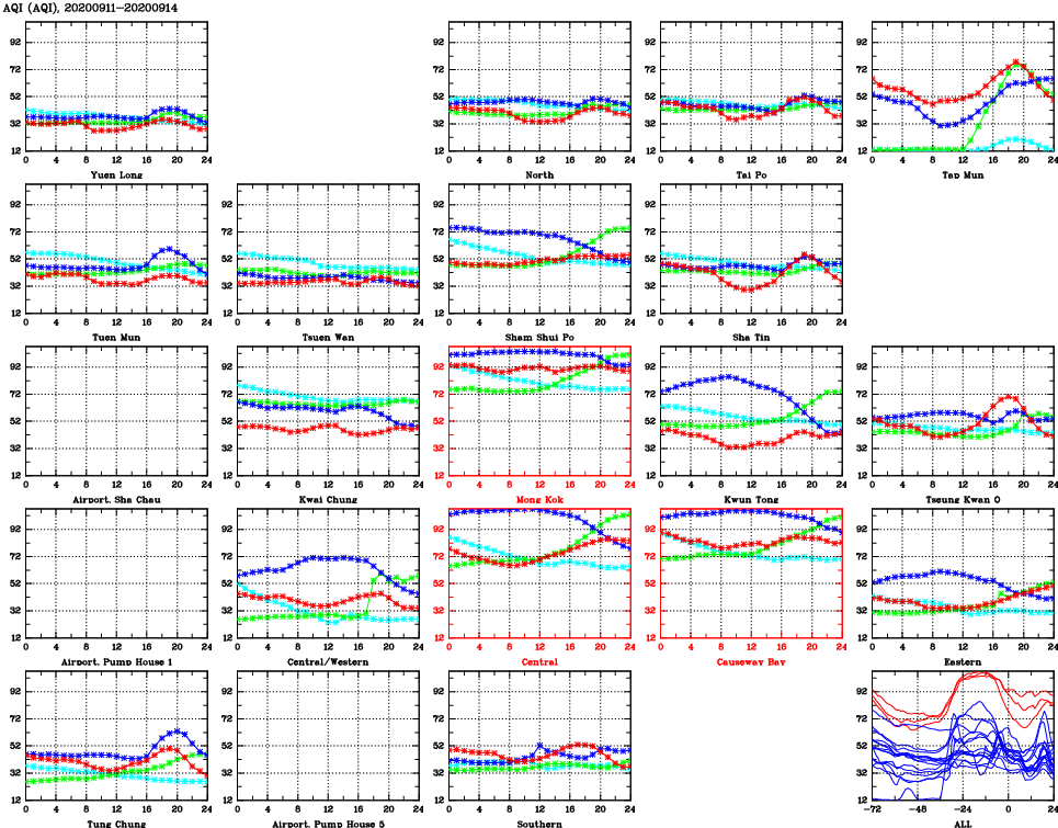 | Air Quality Data Time Series for AQI (2020/09/14) | ( Line colors: Day -3 Day -2 Day -1 Current day ) | 2D Map Current AQHI |