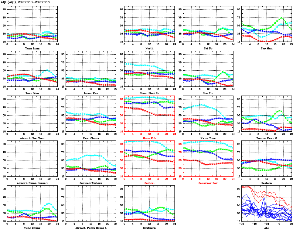 | Air Quality Data Time Series for AQI (2020/09/16) | ( Line colors: Day -3 Day -2 Day -1 Current day ) | 2D Map Current AQHI |