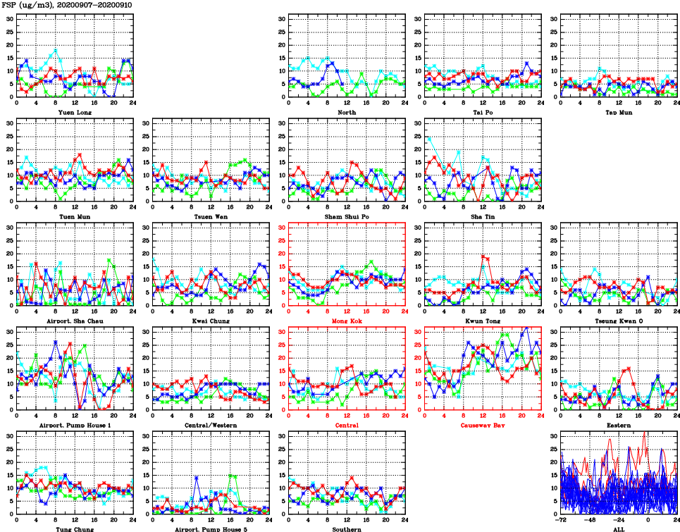 | Air Quality Data Time Series for FSP (2020/09/10) | ( Line colors: Day -3 Day -2 Day -1 Current day ) | 2D Map Current AQHI |