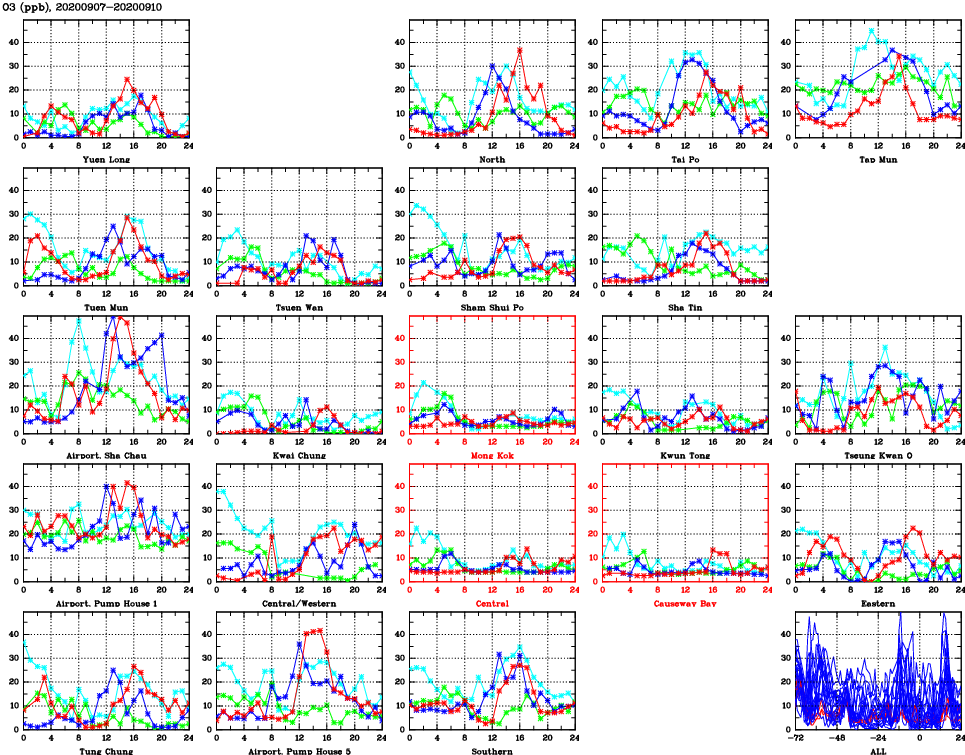 | Air Quality Data Time Series for O3 (2020/09/10) | ( Line colors: Day -3 Day -2 Day -1 Current day ) | 2D Map Current AQHI |