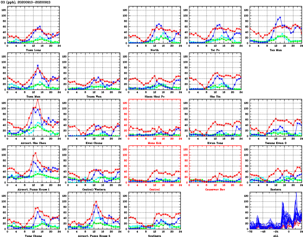 | Air Quality Data Time Series for O3 (2020/09/13) | ( Line colors: Day -3 Day -2 Day -1 Current day ) | 2D Map Current AQHI |