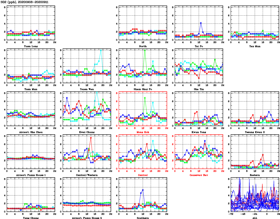 | Air Quality Data Time Series for SO2 (2020/09/11) | ( Line colors: Day -3 Day -2 Day -1 Current day ) | 2D Map Current AQHI |