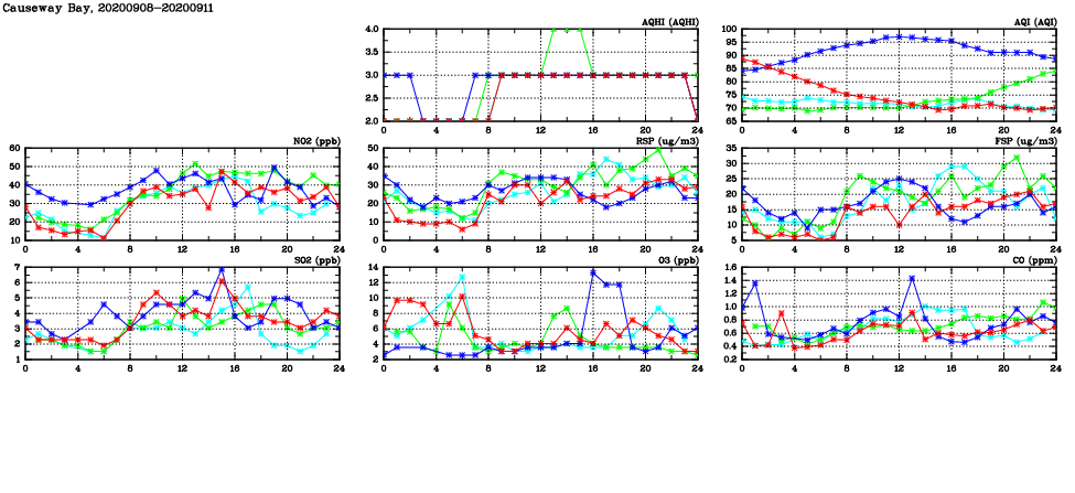 | Air Quality Data Time Series in Causeway Bay (2020/09/11) | ( Line colors: Day -3 Day -2 Day -1 Current day ) | 2D Map Current AQHI |
