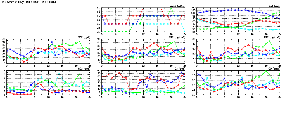 | Air Quality Data Time Series in Causeway Bay (2020/09/14) | ( Line colors: Day -3 Day -2 Day -1 Current day ) | 2D Map Current AQHI |