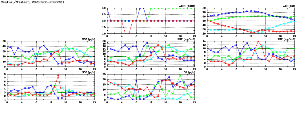 | Air Quality Data Time Series in Central/Western (2020/09/11) | ( Line colors: Day -3 Day -2 Day -1 Current day ) | 2D Map Current AQHI |
