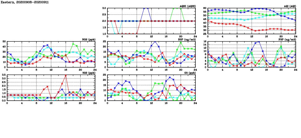 | Air Quality Data Time Series in Eastern (2020/09/11) | ( Line colors: Day -3 Day -2 Day -1 Current day ) | 2D Map Current AQHI |