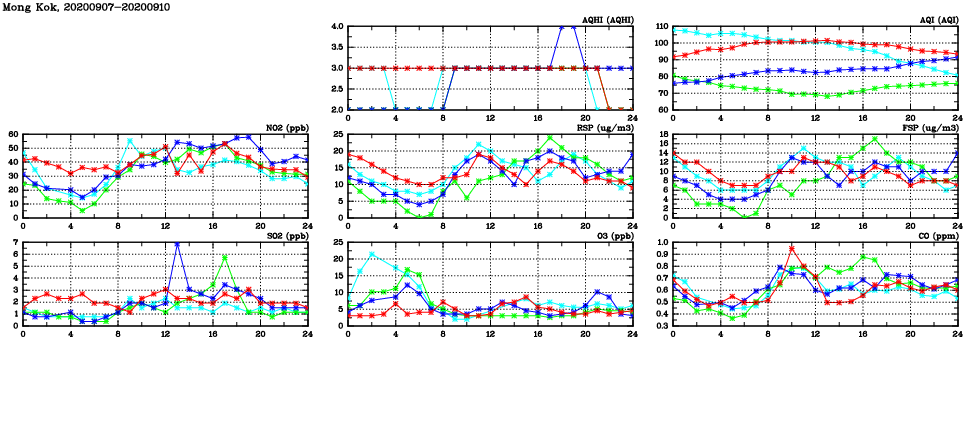 | Air Quality Data Time Series in Mong Kok (2020/09/10) | ( Line colors: Day -3 Day -2 Day -1 Current day ) | 2D Map Current AQHI |