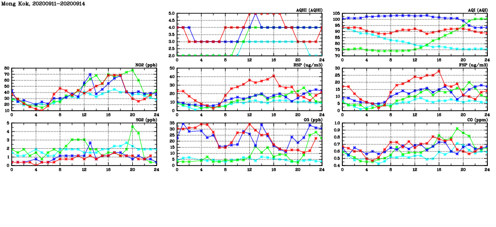 | Air Quality Data Time Series in Mong Kok (2020/09/14) | ( Line colors: Day -3 Day -2 Day -1 Current day ) | 2D Map Current AQHI |