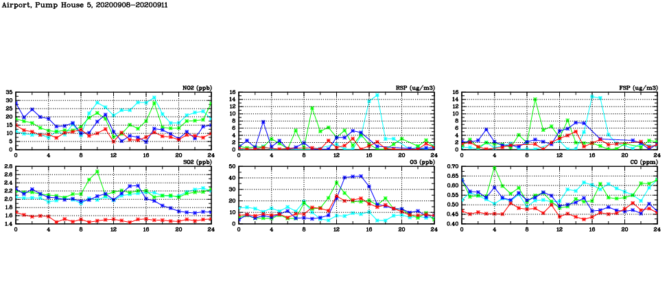 | Air Quality Data Time Series in Airport, Pump House 5 (2020/09/11) | ( Line colors: Day -3 Day -2 Day -1 Current day ) | 2D Map Current AQHI |