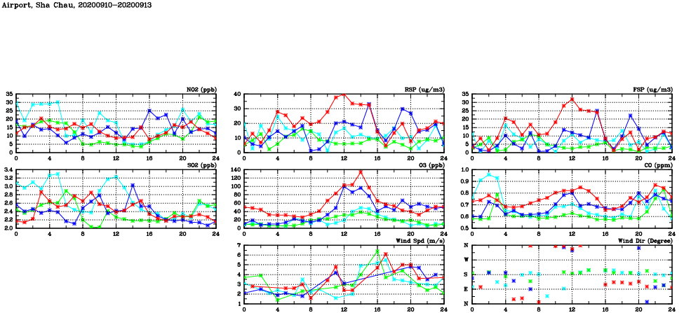 | Air Quality Data Time Series in Airport, Sha Chau (2020/09/13) | ( Line colors: Day -3 Day -2 Day -1 Current day ) | 2D Map Current AQHI |