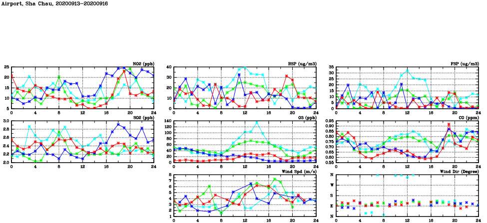 | Air Quality Data Time Series in Airport, Sha Chau (2020/09/16) | ( Line colors: Day -3 Day -2 Day -1 Current day ) | 2D Map Current AQHI |