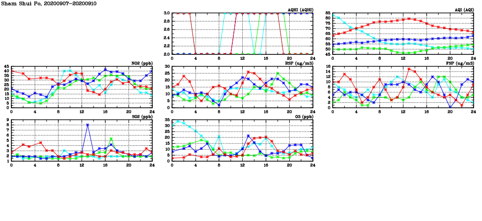 | Air Quality Data Time Series in Sham Shui Po (2020/09/10) | ( Line colors: Day -3 Day -2 Day -1 Current day ) | 2D Map Current AQHI |