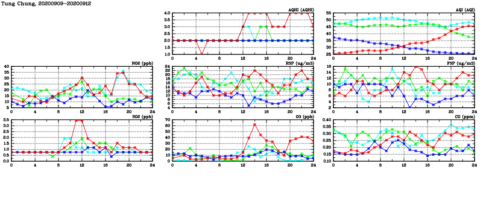 | Air Quality Data Time Series in Tung Chung (2020/09/12) | ( Line colors: Day -3 Day -2 Day -1 Current day ) | 2D Map Current AQHI |