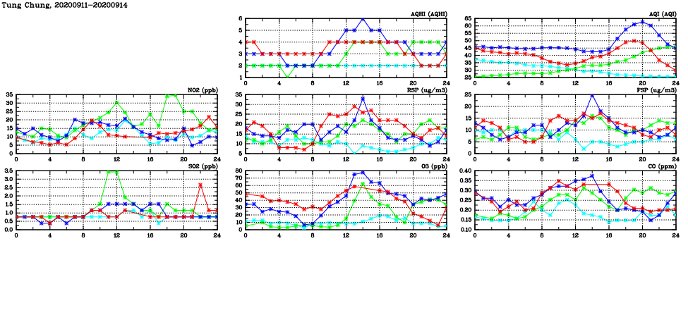 | Air Quality Data Time Series in Tung Chung (2020/09/14) | ( Line colors: Day -3 Day -2 Day -1 Current day ) | 2D Map Current AQHI |