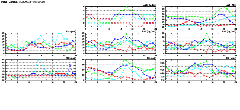| Air Quality Data Time Series in Tung Chung (2020/09/15) | ( Line colors: Day -3 Day -2 Day -1 Current day ) | 2D Map Current AQHI |