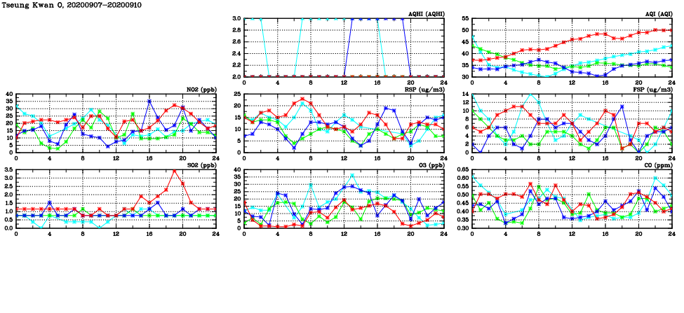 | Air Quality Data Time Series in Tseung Kwan O (2020/09/10) | ( Line colors: Day -3 Day -2 Day -1 Current day ) | 2D Map Current AQHI |