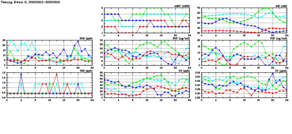| Air Quality Data Time Series in Tseung Kwan O (2020/09/16) | ( Line colors: Day -3 Day -2 Day -1 Current day ) | 2D Map Current AQHI |