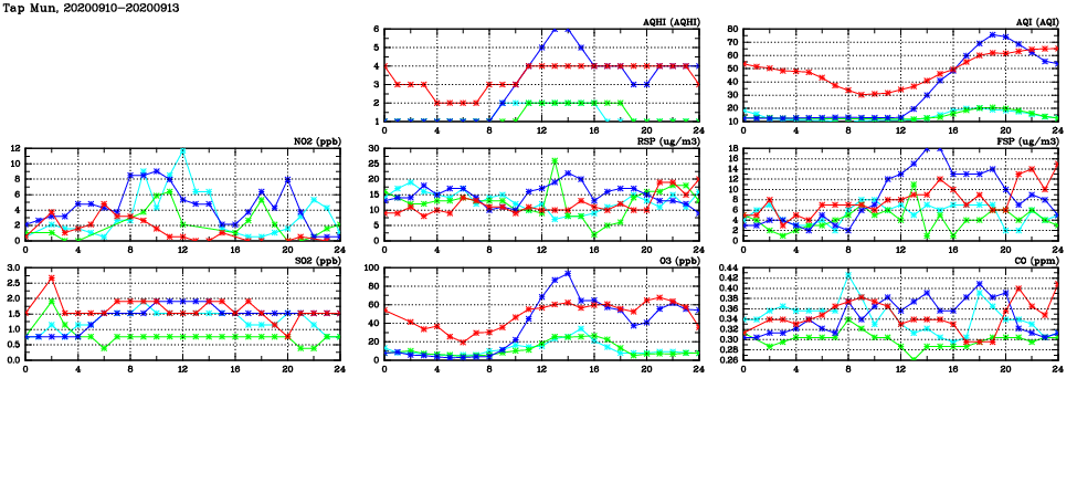 | Air Quality Data Time Series in Tap Mun (2020/09/13) | ( Line colors: Day -3 Day -2 Day -1 Current day ) | 2D Map Current AQHI |