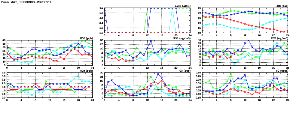 | Air Quality Data Time Series in Tuen Mun (2020/09/11) | ( Line colors: Day -3 Day -2 Day -1 Current day ) | 2D Map Current AQHI |