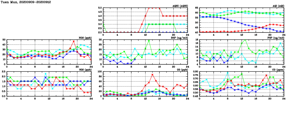 | Air Quality Data Time Series in Tuen Mun (2020/09/12) | ( Line colors: Day -3 Day -2 Day -1 Current day ) | 2D Map Current AQHI |