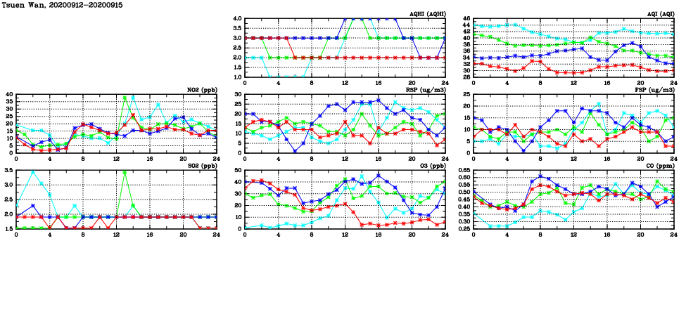 | Air Quality Data Time Series in Tsuen Wan (2020/09/15) | ( Line colors: Day -3 Day -2 Day -1 Current day ) | 2D Map Current AQHI |