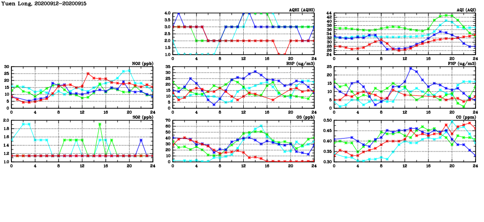 | Air Quality Data Time Series in Yuen Long (2020/09/15) | ( Line colors: Day -3 Day -2 Day -1 Current day ) | 2D Map Current AQHI |