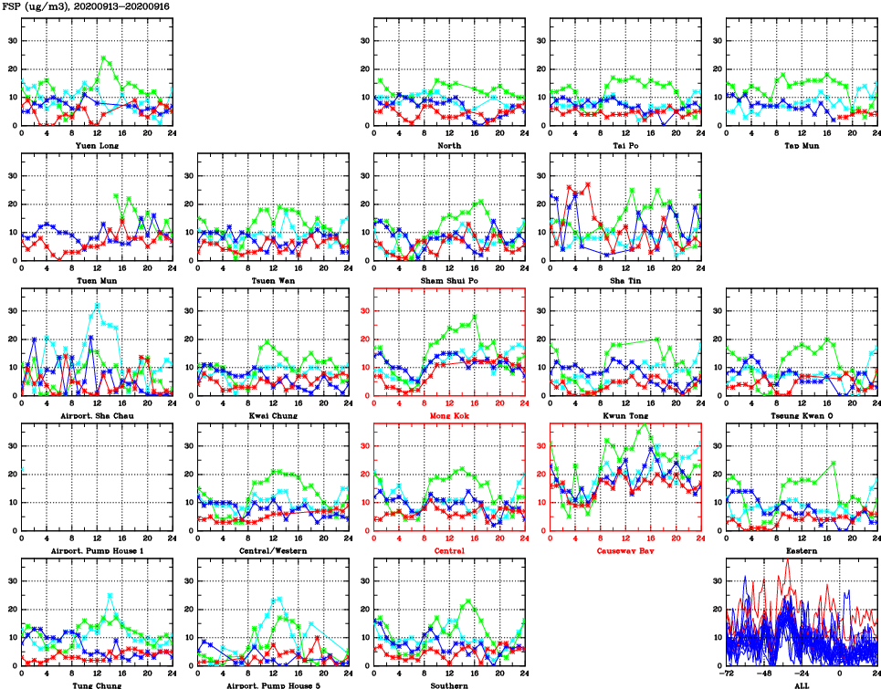 | Air Quality Data Time Series for FSP (2020/09/16) | ( Line colors: Day -3 Day -2 Day -1 Current day ) | 2D Map Current AQHI |