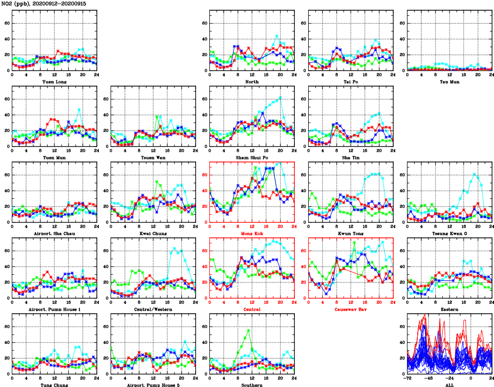 | Air Quality Data Time Series for NO2 (2020/09/15) | ( Line colors: Day -3 Day -2 Day -1 Current day ) | 2D Map Current AQHI |