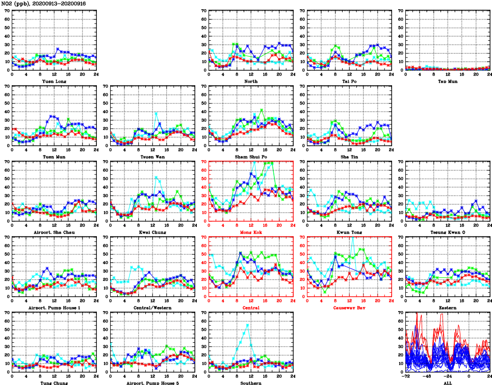 | Air Quality Data Time Series for NO2 (2020/09/16) | ( Line colors: Day -3 Day -2 Day -1 Current day ) | 2D Map Current AQHI |