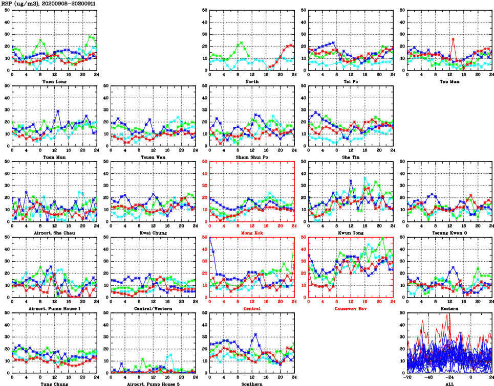 | Air Quality Data Time Series for RSP (2020/09/11) | ( Line colors: Day -3 Day -2 Day -1 Current day ) | 2D Map Current AQHI |