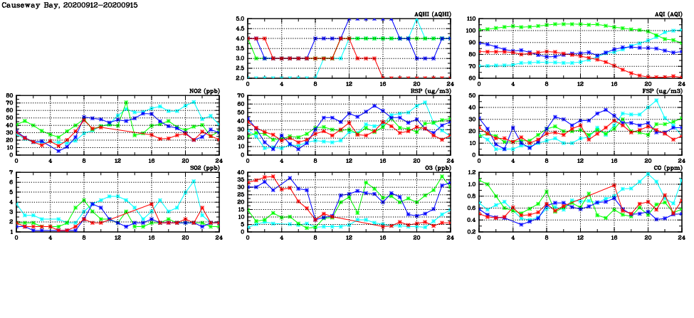 | Air Quality Data Time Series in Causeway Bay (2020/09/15) | ( Line colors: Day -3 Day -2 Day -1 Current day ) | 2D Map Current AQHI |