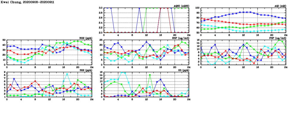 | Air Quality Data Time Series in Kwai Chung (2020/09/11) | ( Line colors: Day -3 Day -2 Day -1 Current day ) | 2D Map Current AQHI |