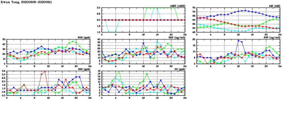 | Air Quality Data Time Series in Kwun Tong (2020/09/11) | ( Line colors: Day -3 Day -2 Day -1 Current day ) | 2D Map Current AQHI |