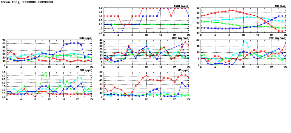 | Air Quality Data Time Series in Kwun Tong (2020/09/13) | ( Line colors: Day -3 Day -2 Day -1 Current day ) | 2D Map Current AQHI |