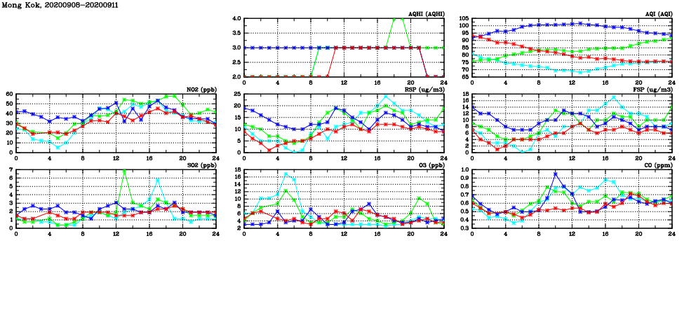 | Air Quality Data Time Series in Mong Kok (2020/09/11) | ( Line colors: Day -3 Day -2 Day -1 Current day ) | 2D Map Current AQHI |