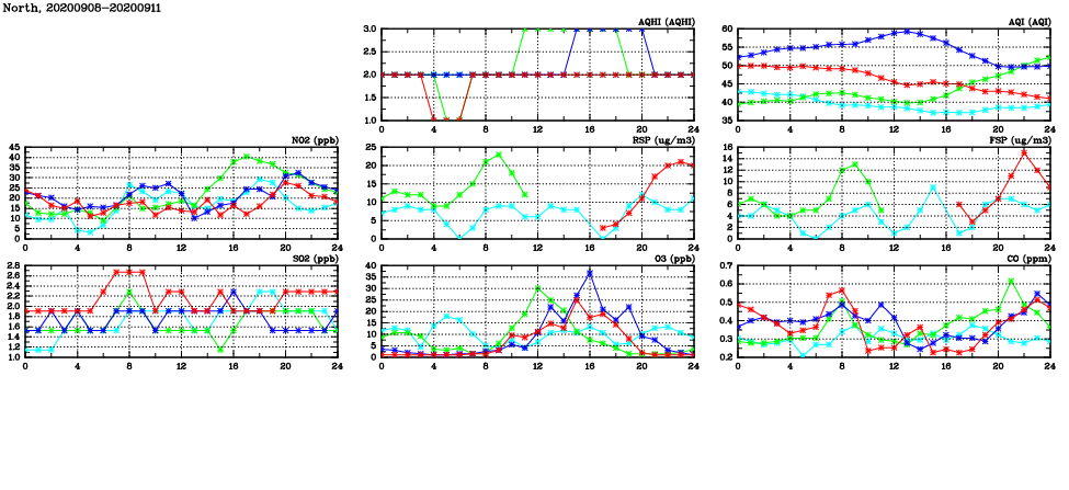 | Air Quality Data Time Series in North (2020/09/11) | ( Line colors: Day -3 Day -2 Day -1 Current day ) | 2D Map Current AQHI |