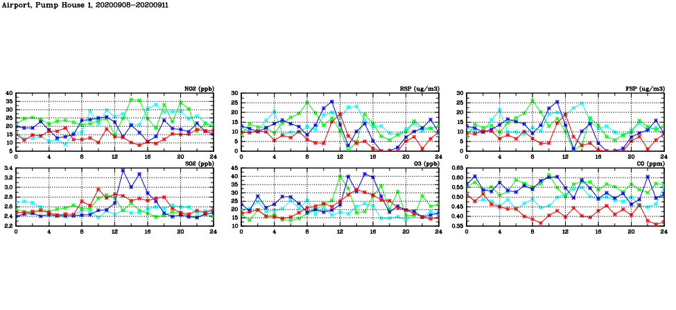 | Air Quality Data Time Series in Airport, Pump House 1 (2020/09/11) | ( Line colors: Day -3 Day -2 Day -1 Current day ) | 2D Map Current AQHI |