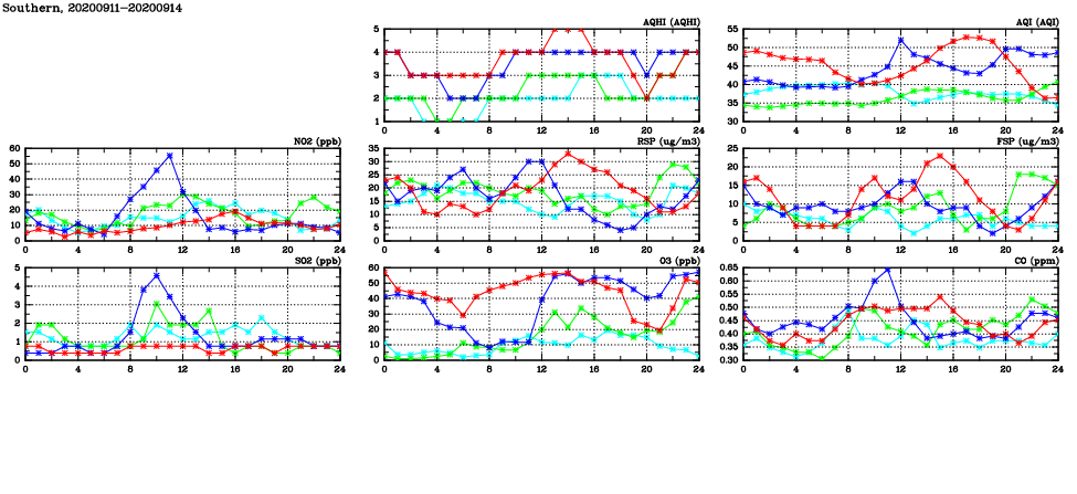 | Air Quality Data Time Series in Southern (2020/09/14) | ( Line colors: Day -3 Day -2 Day -1 Current day ) | 2D Map Current AQHI |