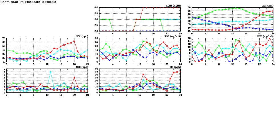 | Air Quality Data Time Series in Sham Shui Po (2020/09/12) | ( Line colors: Day -3 Day -2 Day -1 Current day ) | 2D Map Current AQHI |