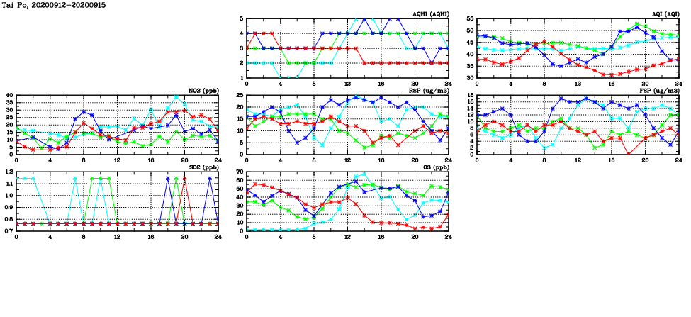 | Air Quality Data Time Series in Tai Po (2020/09/15) | ( Line colors: Day -3 Day -2 Day -1 Current day ) | 2D Map Current AQHI |