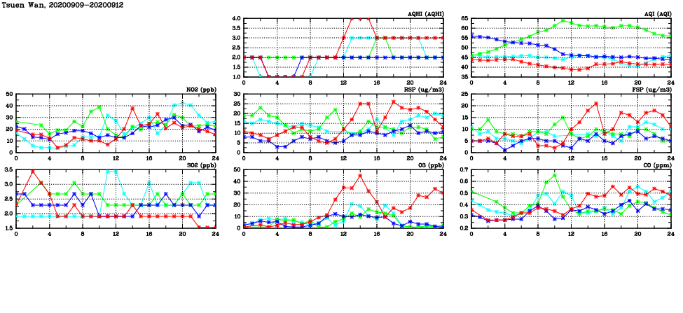| Air Quality Data Time Series in Tsuen Wan (2020/09/12) | ( Line colors: Day -3 Day -2 Day -1 Current day ) | 2D Map Current AQHI |