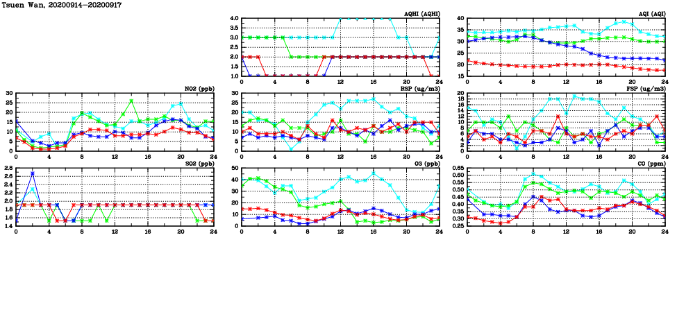 | Air Quality Data Time Series in Tsuen Wan (2020/09/17) | ( Line colors: Day -3 Day -2 Day -1 Current day ) | 2D Map Current AQHI |
