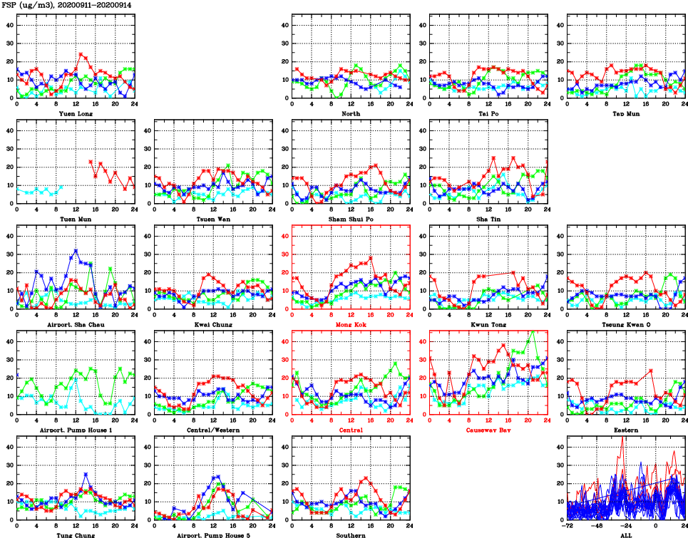 | Air Quality Data Time Series for FSP (2020/09/14) | ( Line colors: Day -3 Day -2 Day -1 Current day ) | 2D Map Current AQHI |