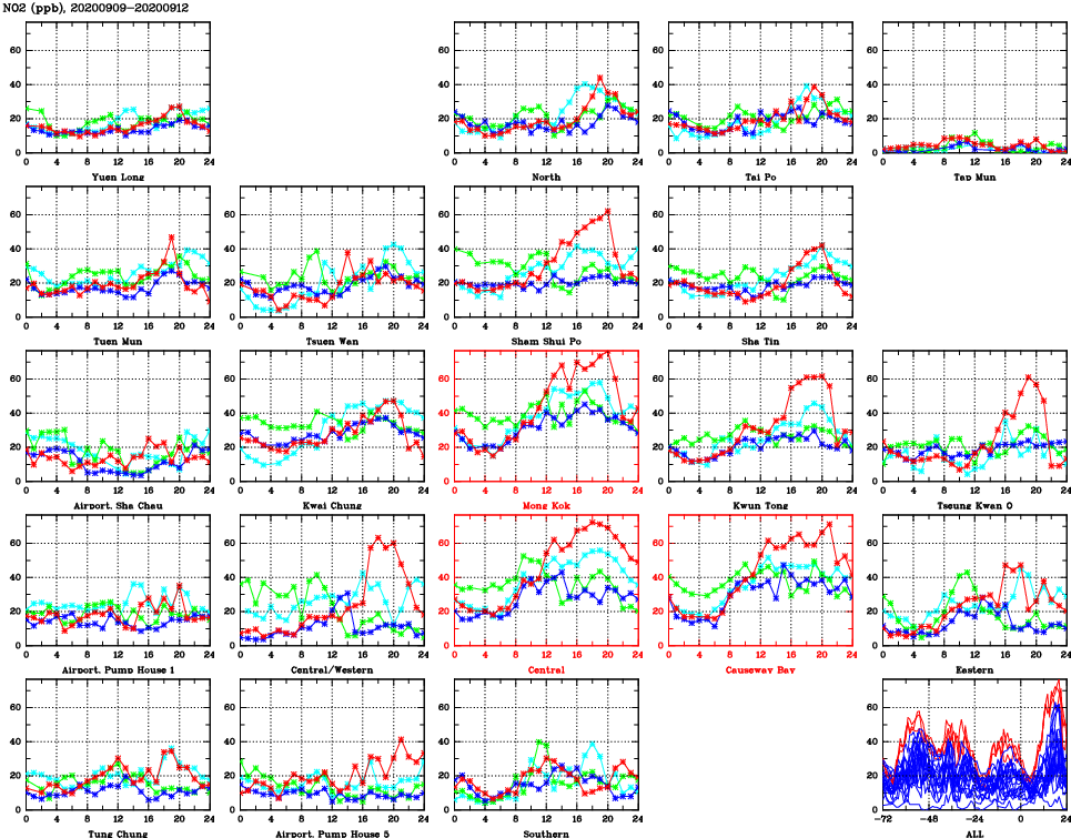 | Air Quality Data Time Series for NO2 (2020/09/12) | ( Line colors: Day -3 Day -2 Day -1 Current day ) | 2D Map Current AQHI |