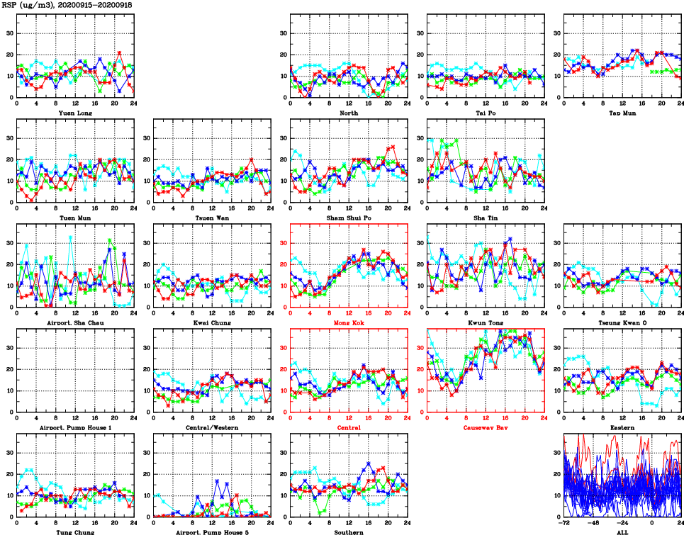 | Air Quality Data Time Series for RSP (2020/09/18) | ( Line colors: Day -3 Day -2 Day -1 Current day ) | 2D Map Current AQHI |