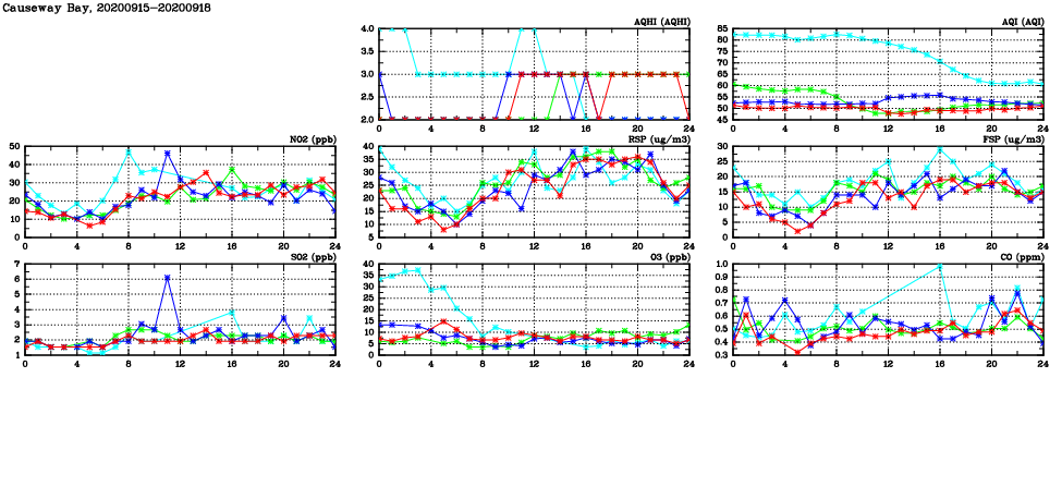 | Air Quality Data Time Series in Causeway Bay (2020/09/18) | ( Line colors: Day -3 Day -2 Day -1 Current day ) | 2D Map Current AQHI |